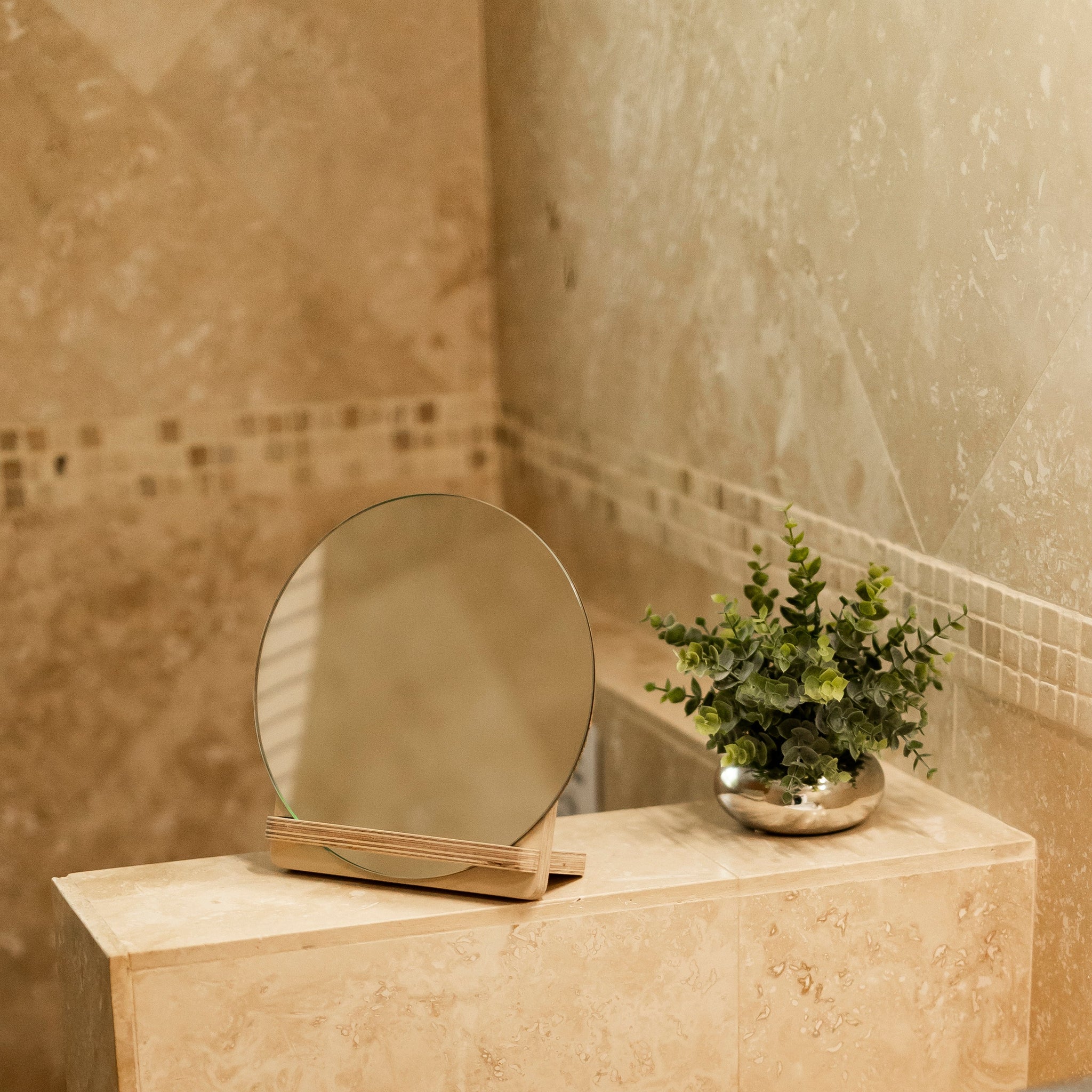 Self standing desk mirror with a Birch Plywood base. The Minimal Desk Mirror really adds a beautiful but functional feature to your space. It is also collapsible which means you can take it with you on your travels.